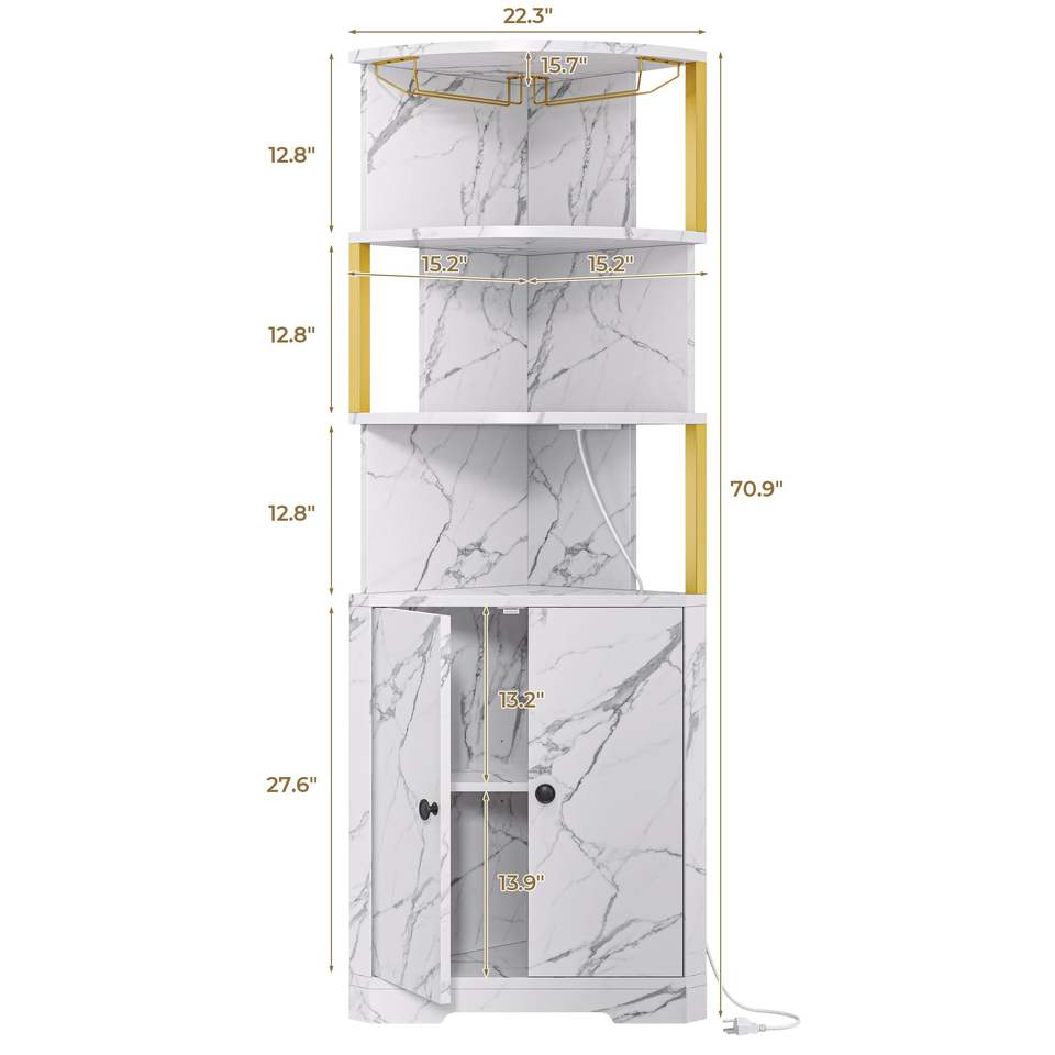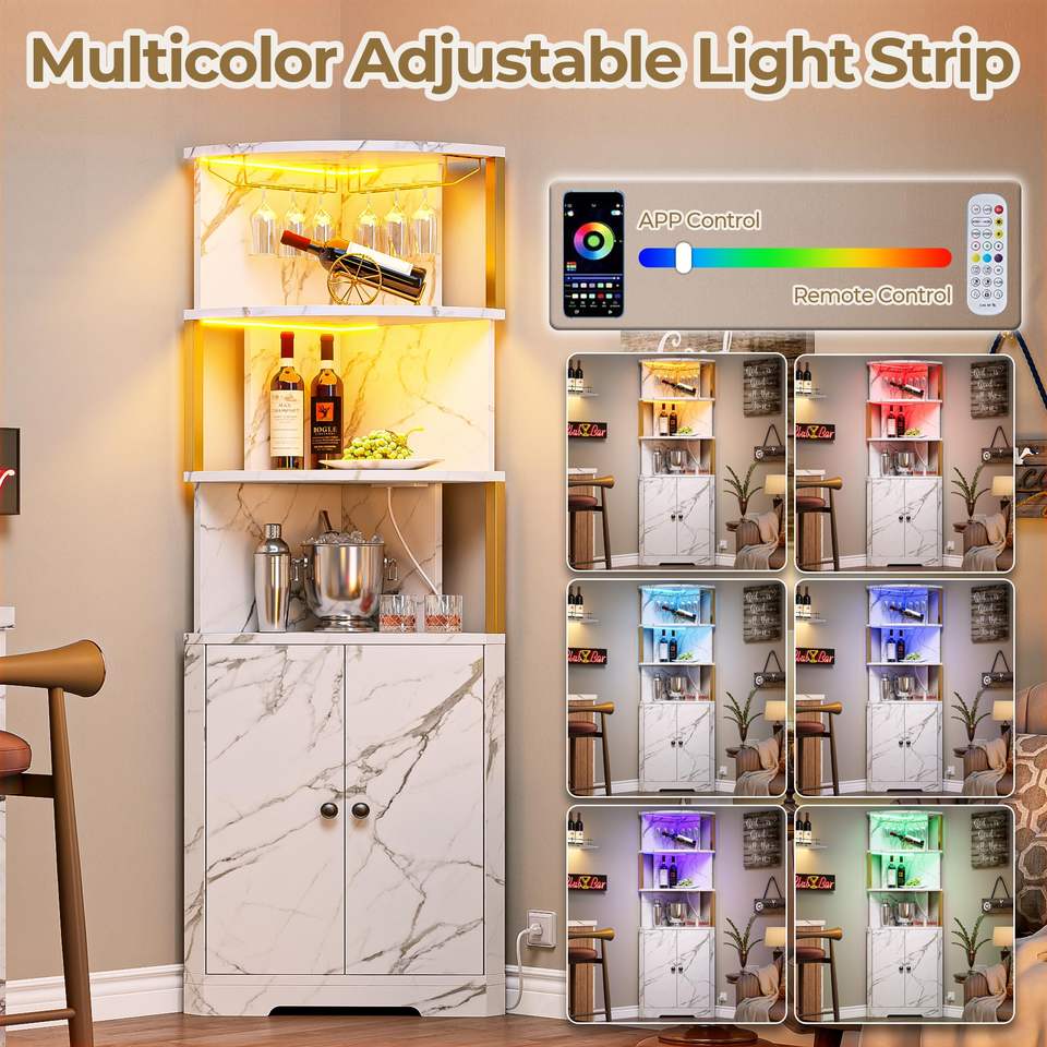 Meuble d'angle de bar moderne avec éclairage LED, finition marbre, écologique, pour le rangement des spiritueux et le support à verres à vin, pour salon
