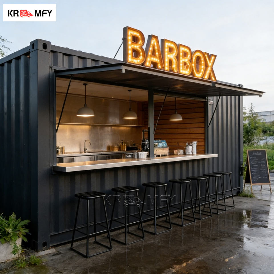 Bar multifonctionnel moderne avec terrasse, maison conteneur extensible pour expériences café en plein air, utilisation en bureau