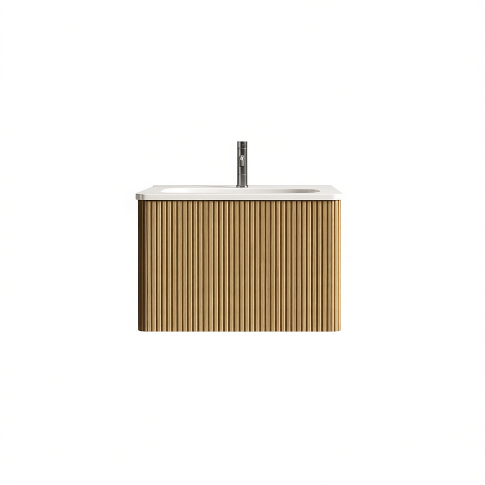 Meuble-lavabo de salle de bain moderne 24 pouces en chêne naturel, suspendu au mur, avec vasque en céramique blanche, design rectangulaire