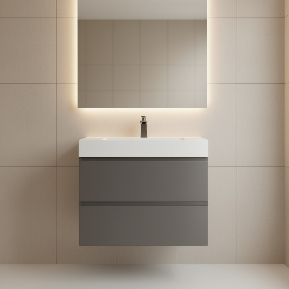 Meuble-lavabo de salle de bain moderne 30 pouces gris, design mural flottant, vasque monobloc blanche, robinet noir mat