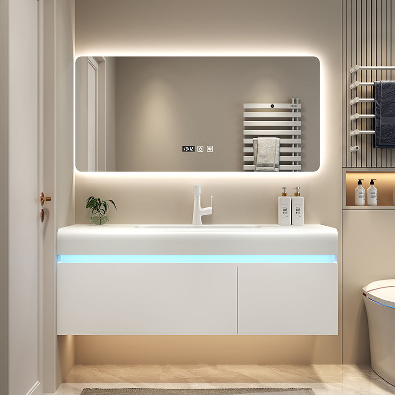 Meuble sous-vasque de salle de bain moderne Portes en bois massif Miroir intelligent en céramique Contreplaqué étanche mural écologique pour appartement