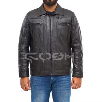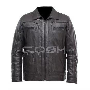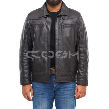 Veste moderne noire de style Cafe Racer avec poches zippées | Vestes en cuir véritable pour hommes, style streetwear, avec col montant