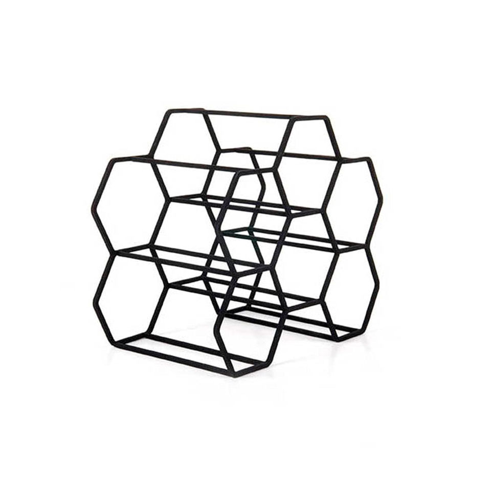 Porte-bouteilles et présentoir à vin en métal noir moderne, autoportant, géométrique, hexagonal, pour table, rangement et présentation de bouteilles pour bar à domicile