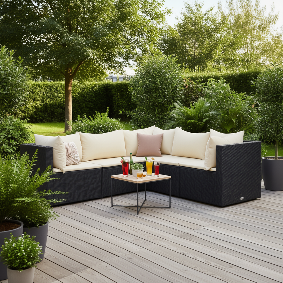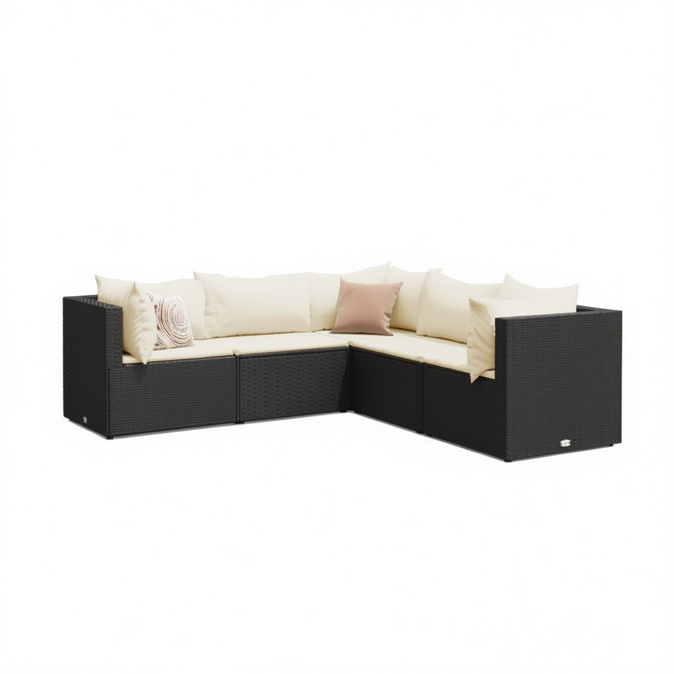 Ensemble de salon de jardin en rotin noir moderne avec coussins crème, capacité 7 personnes, mobilier d'extérieur