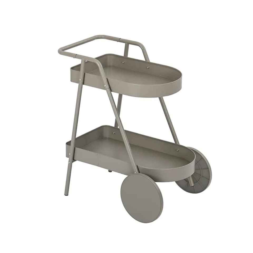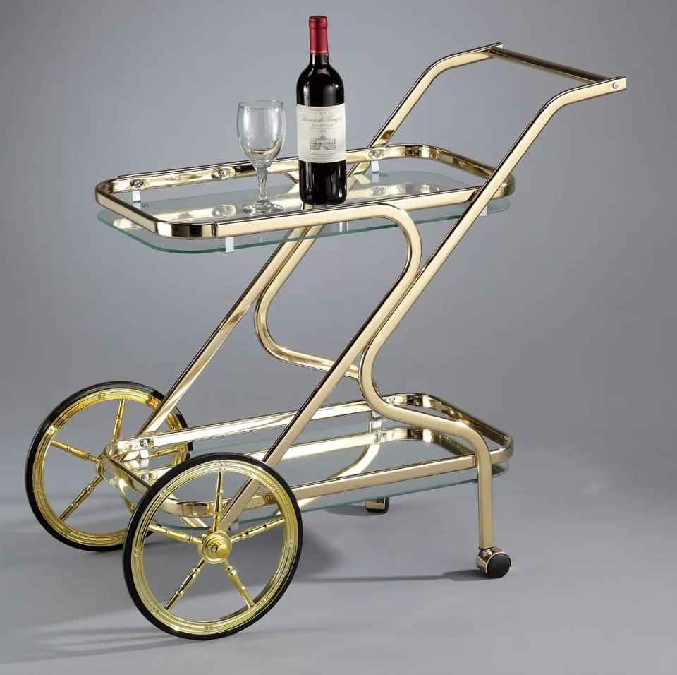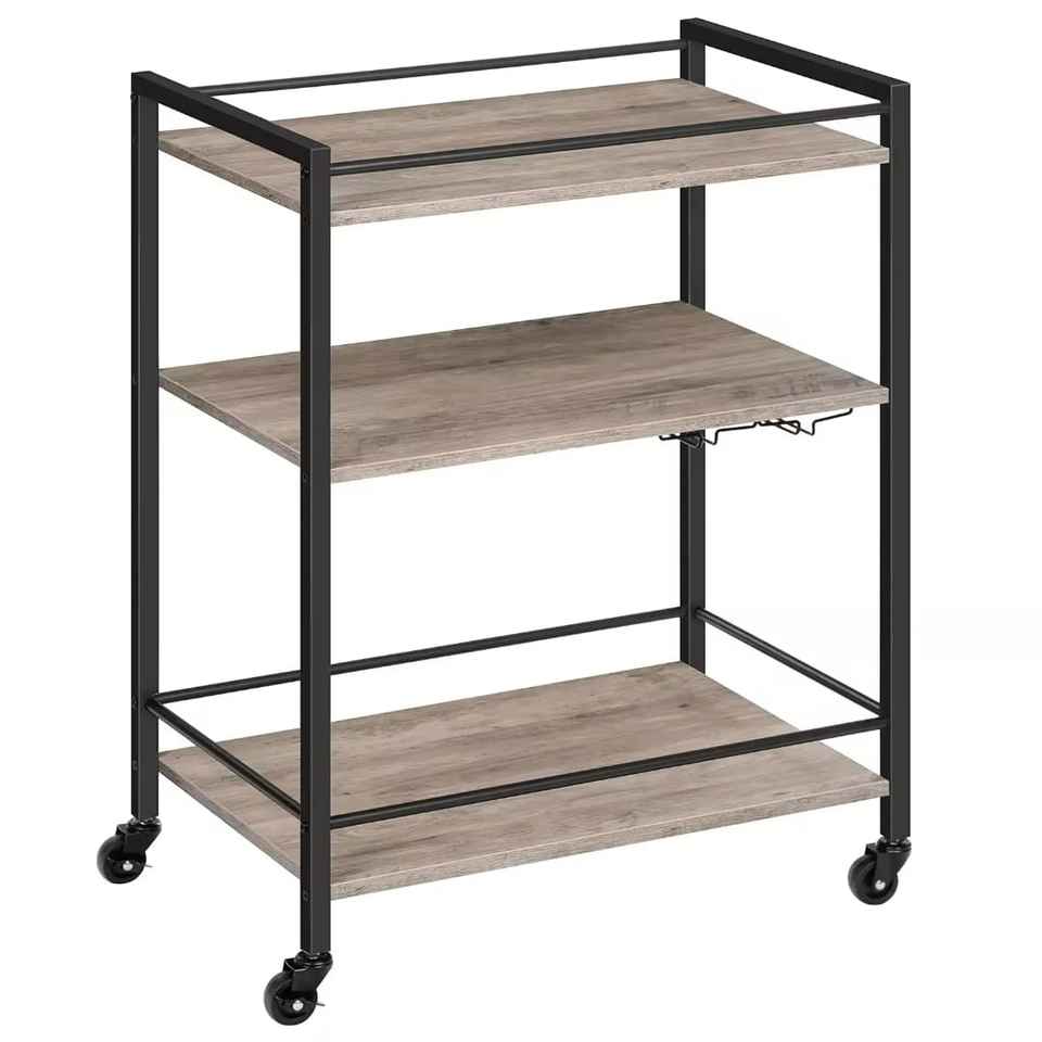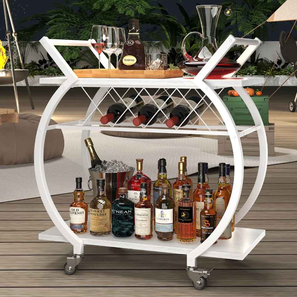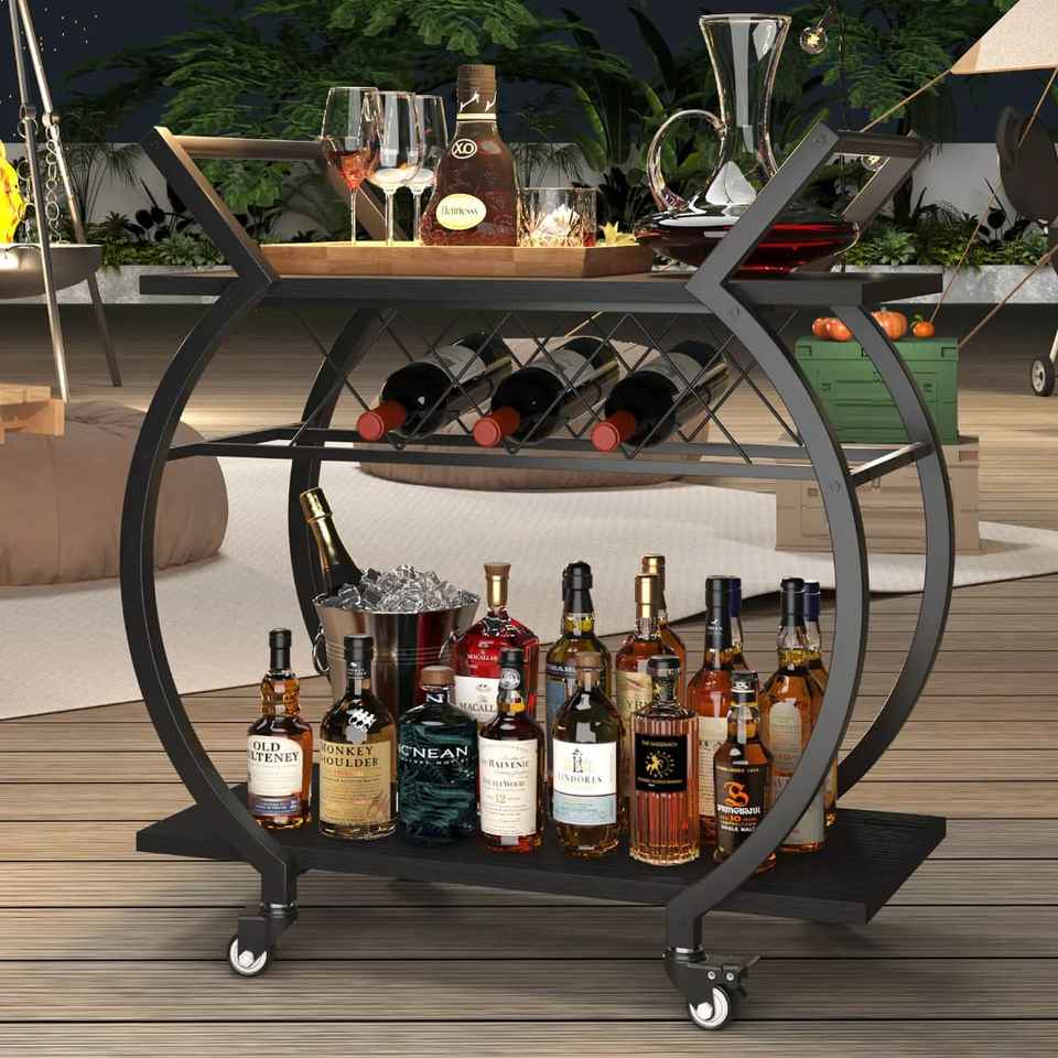 Chariot de bar moderne noir à cadre rond avec porte-bouteilles, chariot de service roulant en bois à 2 niveaux pour fêtes en extérieur et en intérieur