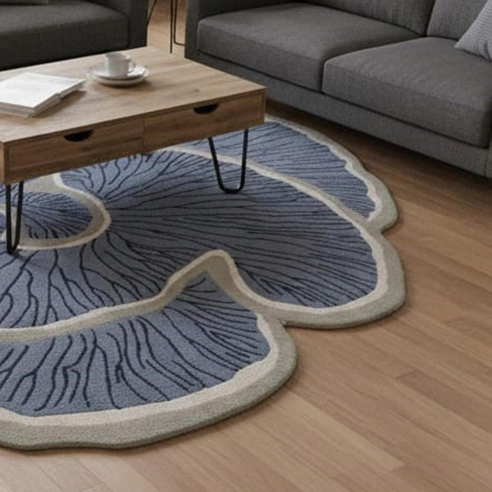 Tapis moderne bleu design, forme de trèfle irrégulière, tapis en laine fait main, décoration intérieure personnalisée avec dos en latex, cadeau de nouvel an