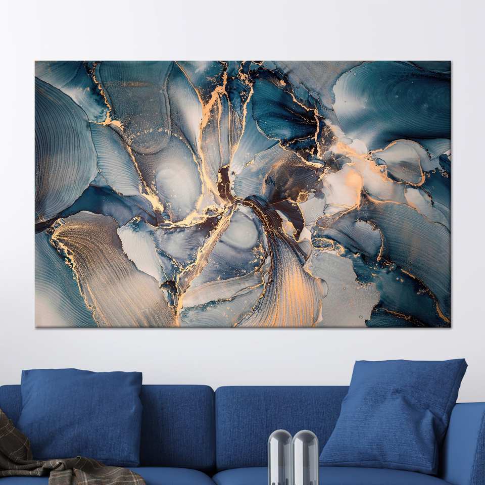 Impression sur toile abstraite moderne bleue et orange, encadrée style galerie