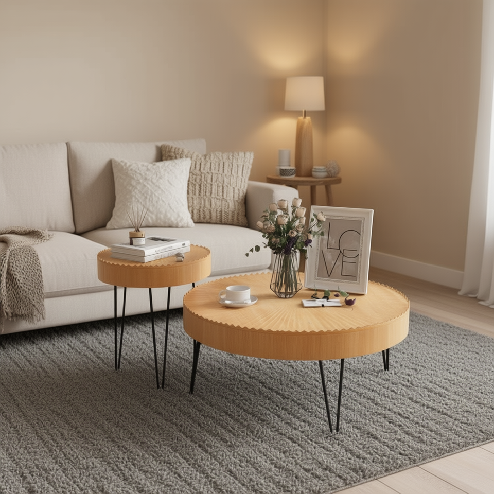 Tables basses rondes modernes style bohème, lot de 2, plateau en pin massif, pieds en métal, meubles de salon imbriqués, finition naturelle