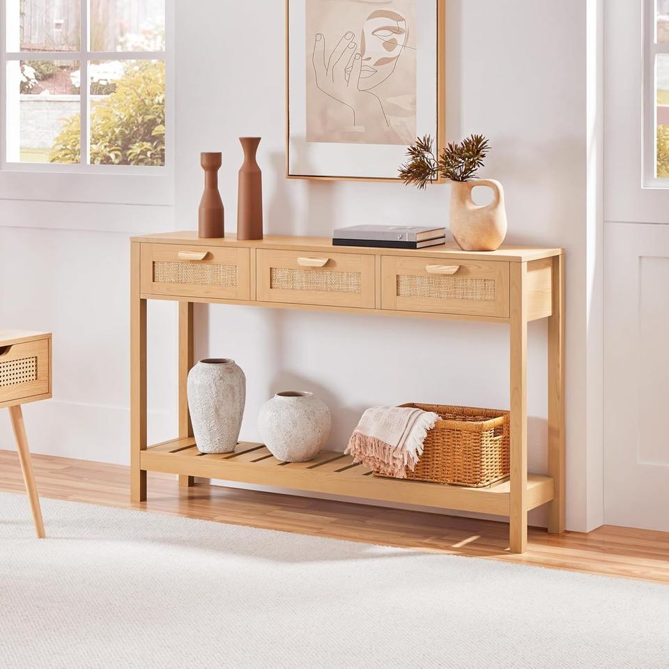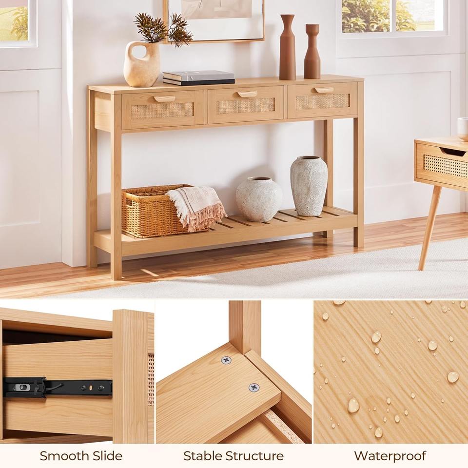Table console en bois naturel personnalisée de style Boho moderne avec 3 tiroirs en rotin et étagère à 2 niveaux pour villa, salon et hôtel