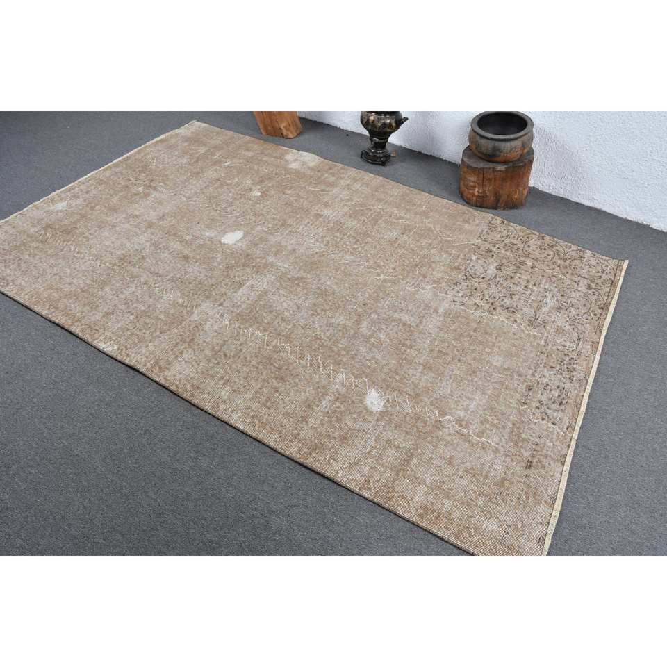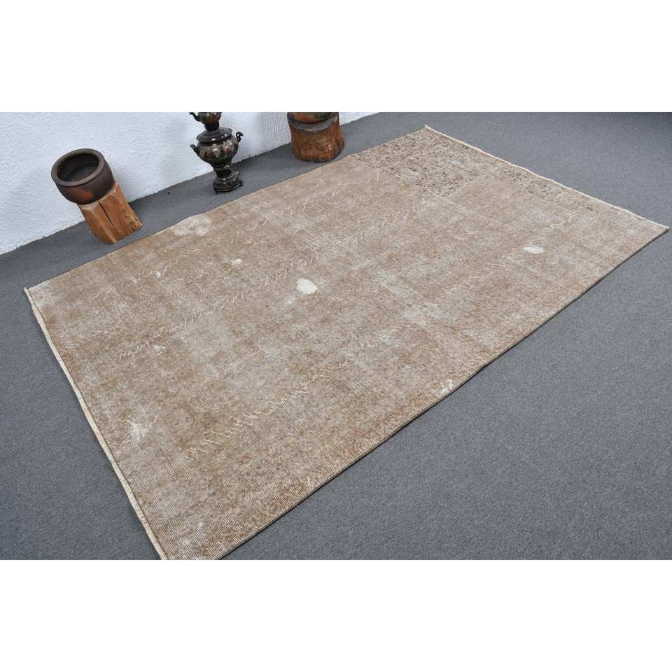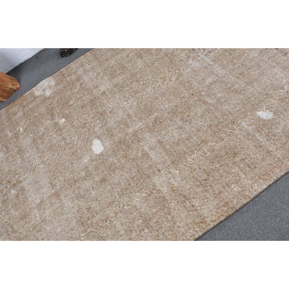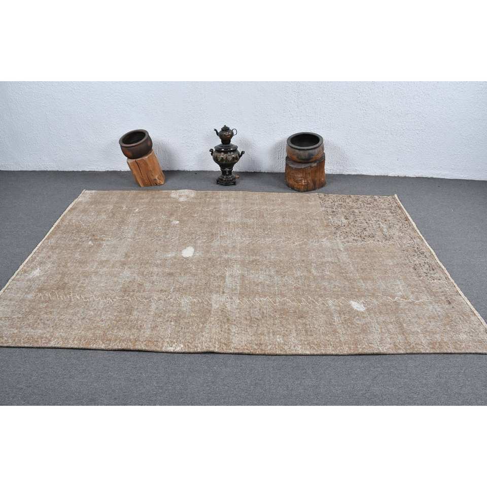Modern Brown Beige Vintage Turkish Rug 5.3 X 8.1 ft Classic Rectangle Patchwork Design Wool Faux Rabbit Fur Latex Classic