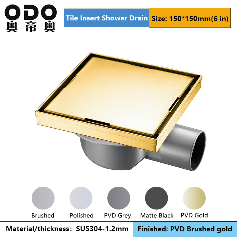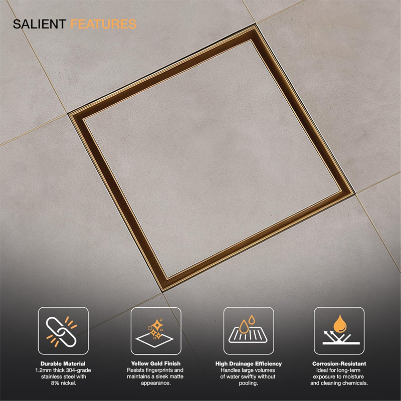 Siphon de douche carré moderne en or brossé de 6 pouces avec adaptateur de sortie horizontale, en acier inoxydable 304, pour insertion de carrelage