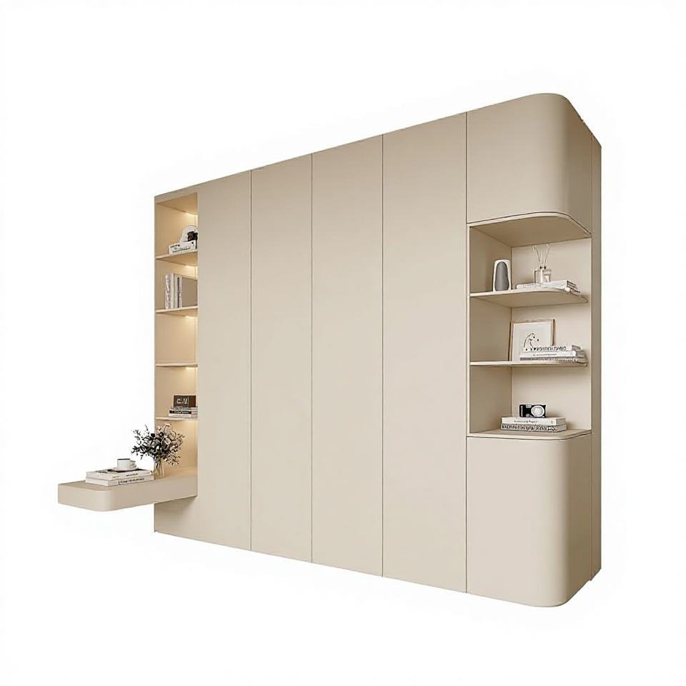 Ensemble de placard de chambre à coucher intégré moderne - Étagères latérales éclairées par LED et coiffeuse avec armoires à bords incurvés
