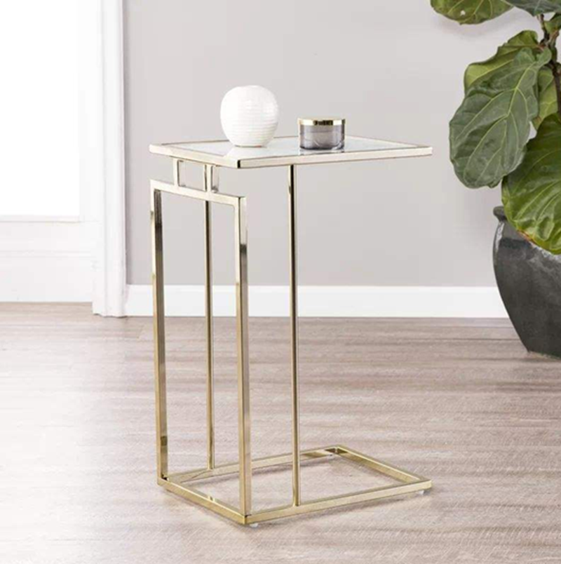 Table d'appoint moderne en forme de C avec plateau en verre trempé et structure métallique, table basse pour collations ou plateau TV pour petits espaces