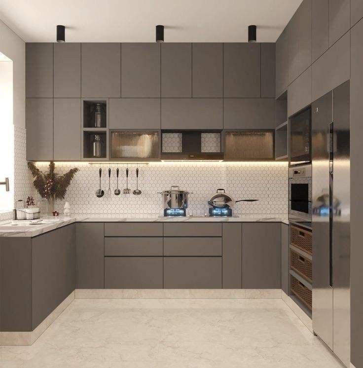 Conception de cuisine modulaire de type C moderne avec armoires à finition mate, appareils électroménagers intégrés, éclairage doux et disposition gain de place