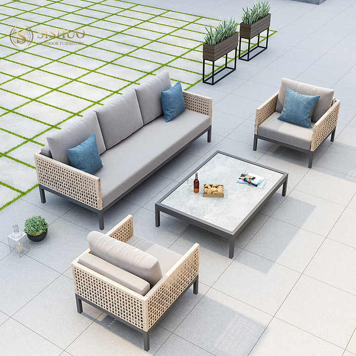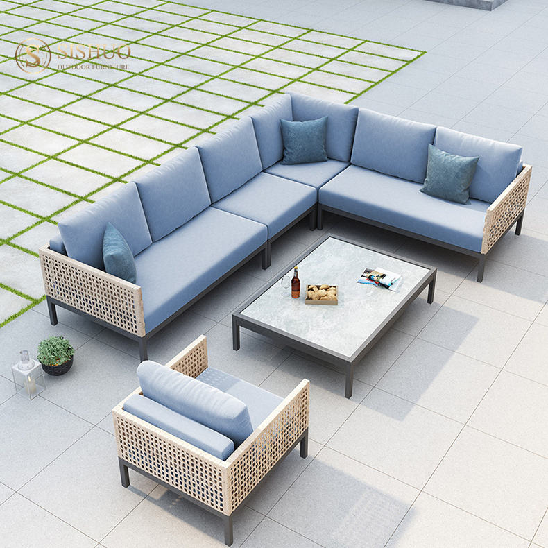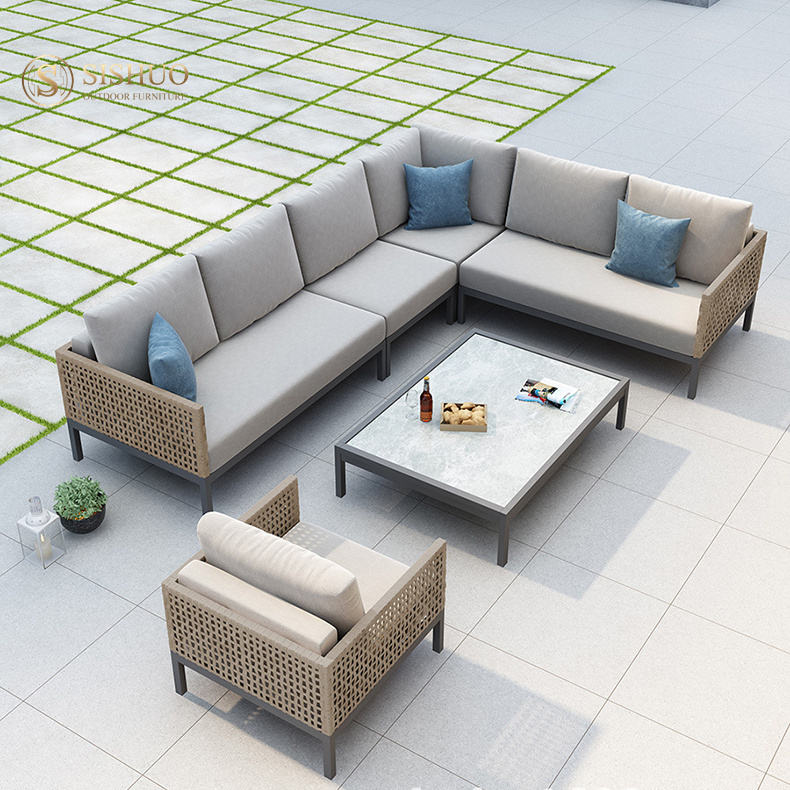 Salon moderne pas cher cadre en aluminium tissé à la main corde en osier forme en L canapé de jardin pour terrasse extérieure