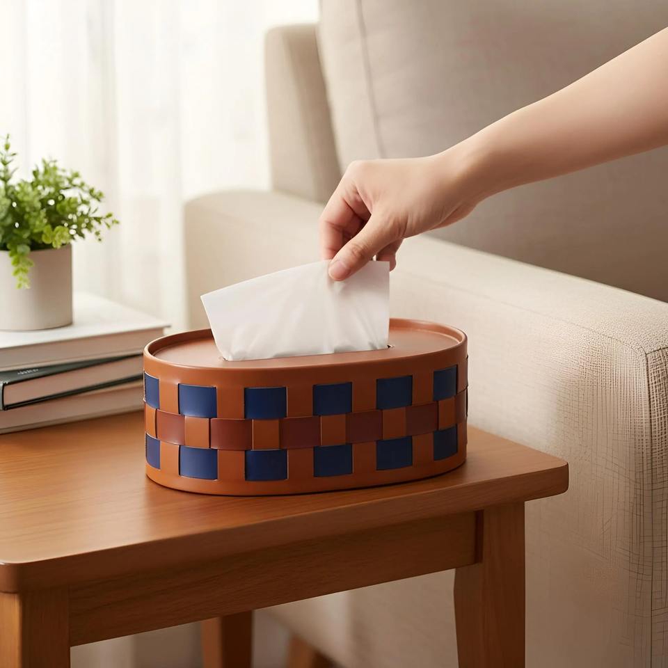 Porte-mouchoirs en similicuir à motif damier moderne, couleur beige et bleu, parfait pour la maison, le bureau et la table, fabriqué en Inde.