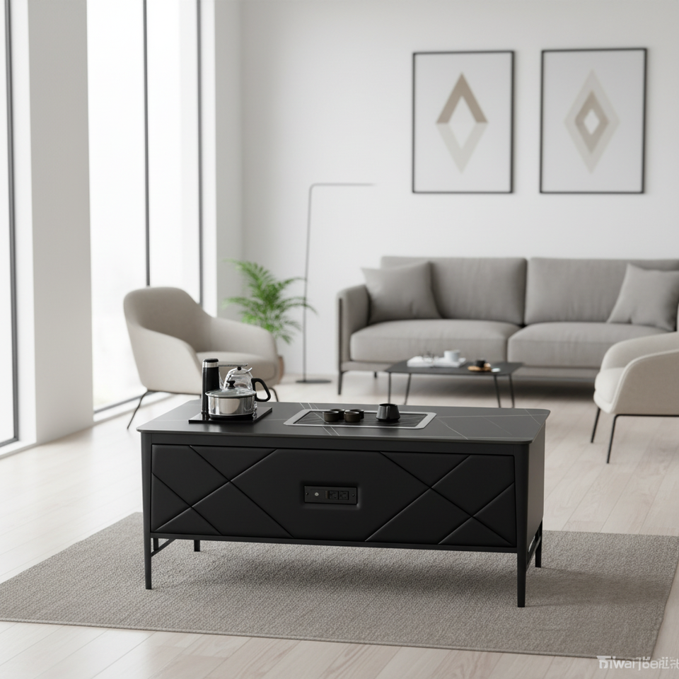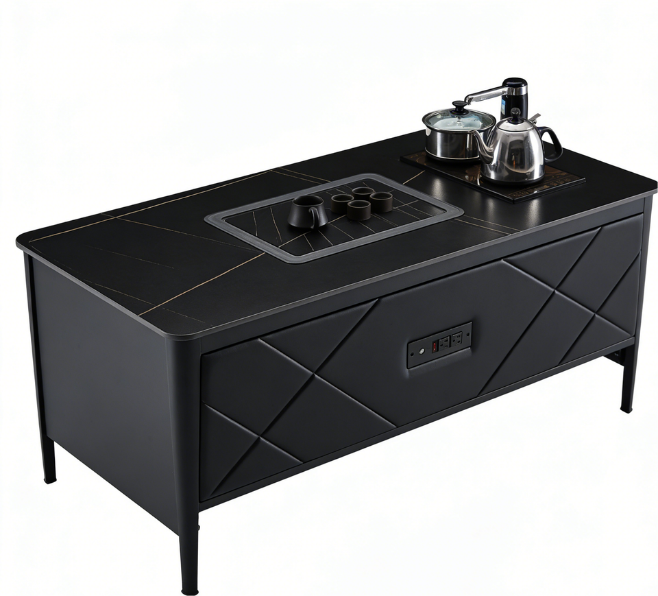 Table à thé et café Kung Fu de style chinois moderne avec comptoir en ardoise noire, grande capacité de rangement et prise intégrée