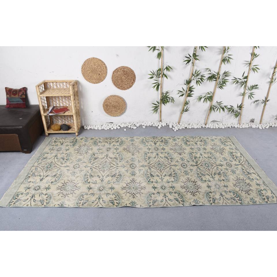 Tapis en laine écologique classique moderne, motif patchwork vert beige, 4,7 pi x 9,6 pi, salle à manger, dos en latex, hauteur du poil pelucheux