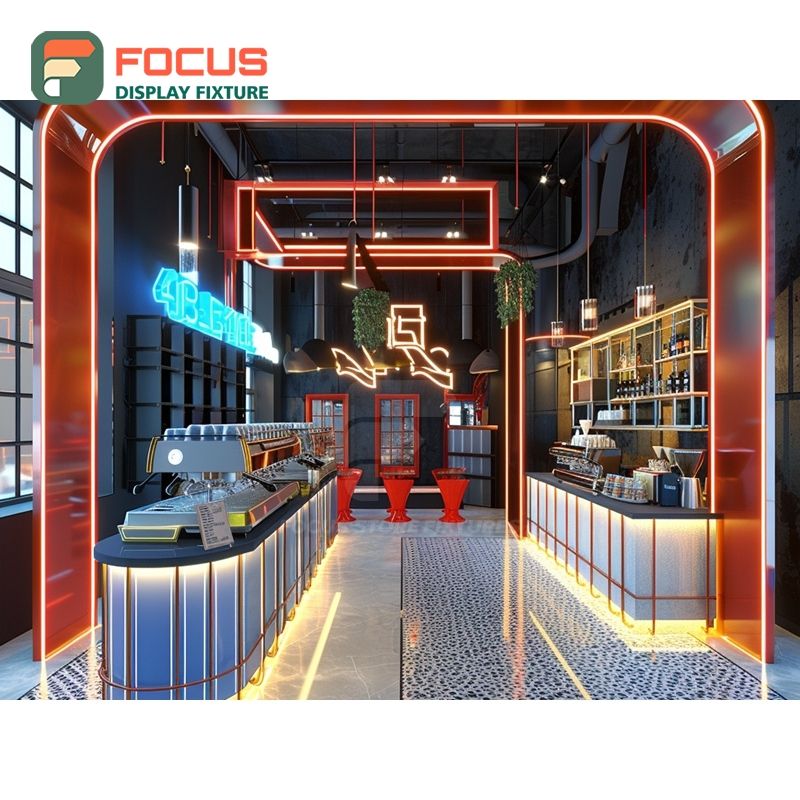 Étagère de présentation de café moderne, haute, ouverte, pour l'espace de vente de grains, avec cadre noir, pour la présentation de produits de café
