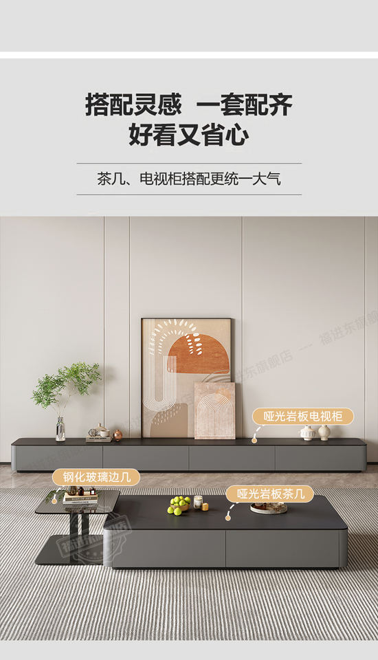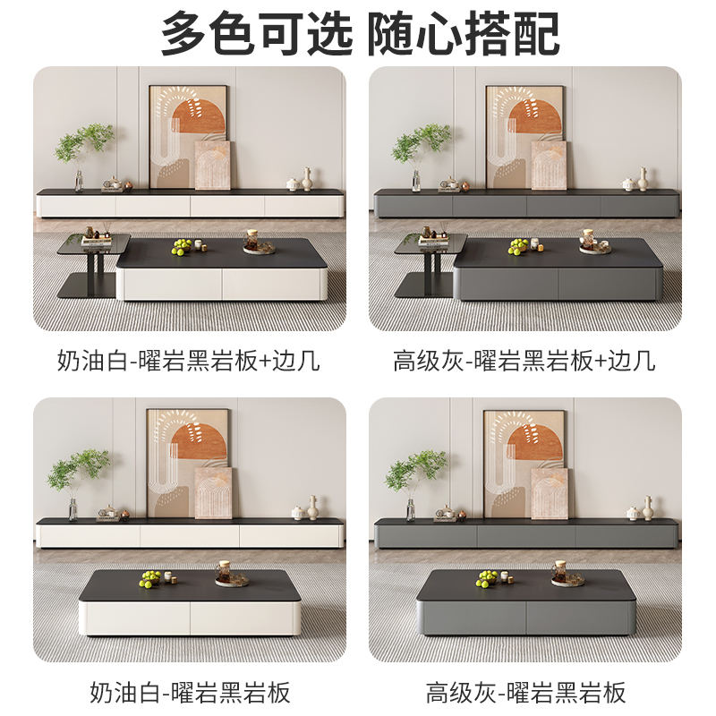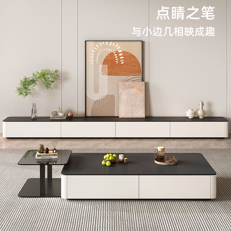 Table basse et meuble TV modernes avec plateau en pierre frittée et bois, meuble TV pour salon