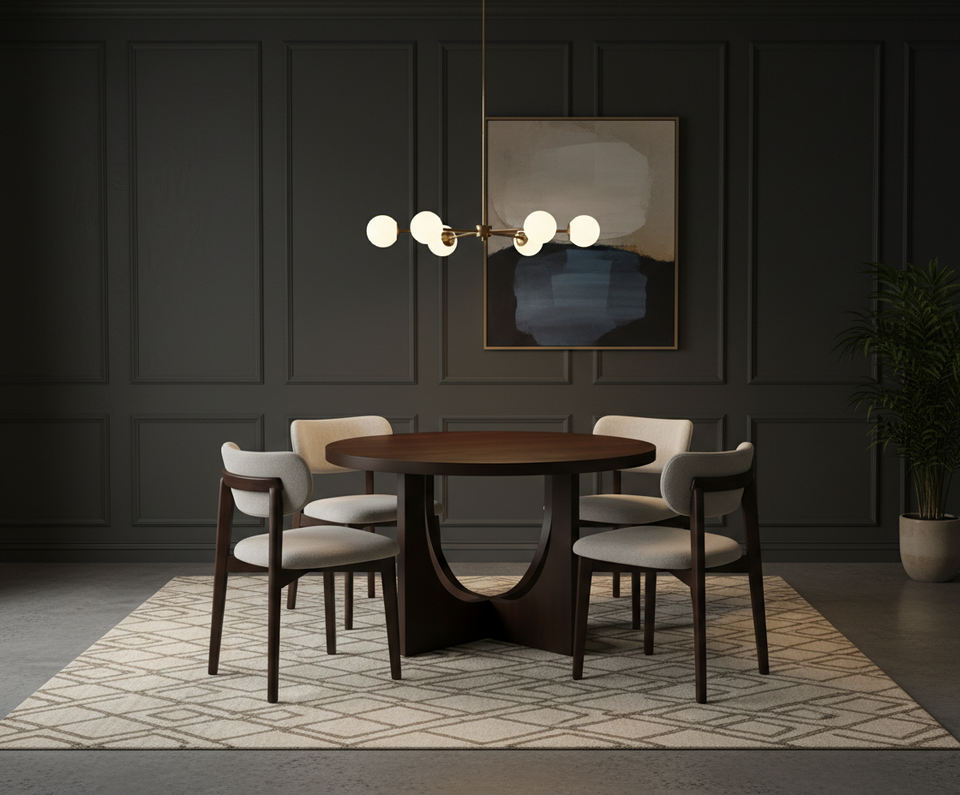 Table basse moderne avec 4 chaises en bois de caoutchouc et chêne, design durable et léger, garantie 1 an, ensemble compact pour salon