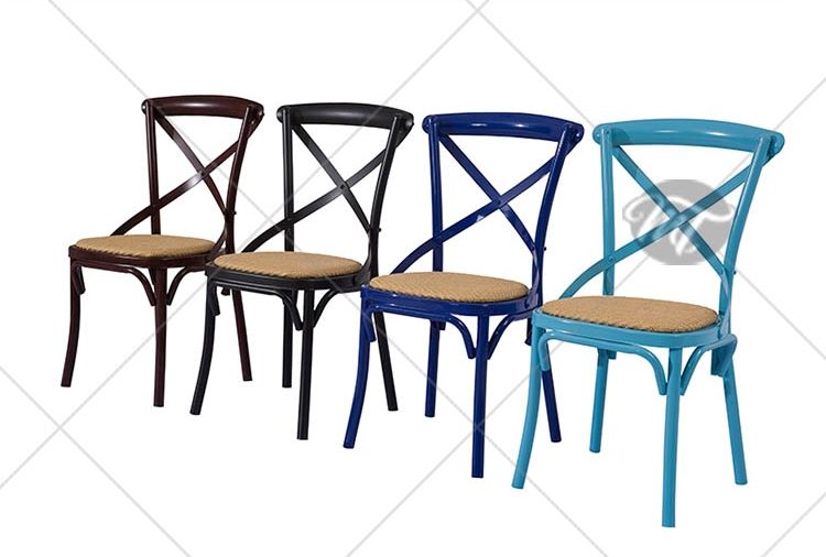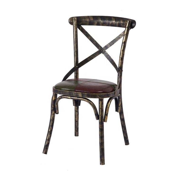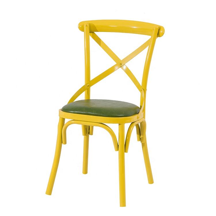 Chaise de bistrot industrielle moderne colorée en métal grain de bois à dossier croisé