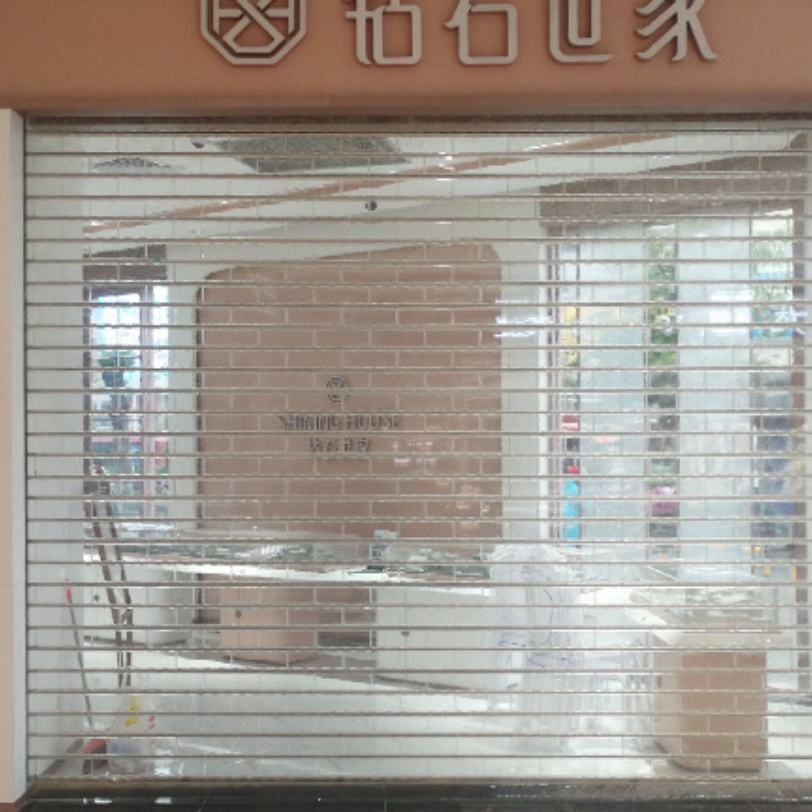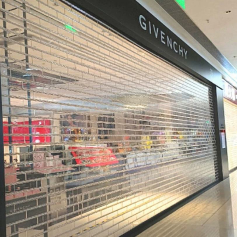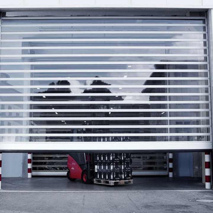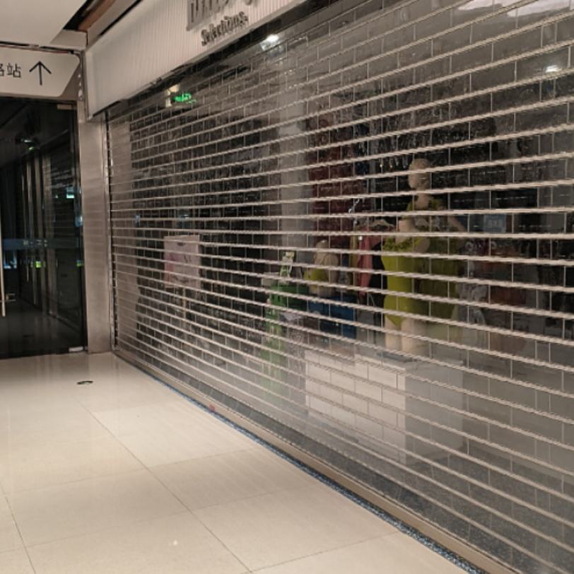 Porte de sécurité automatique moderne combinée en panneau PVC et structure en alliage d'aluminium, antivol et offrant une visibilité optimale pour les devantures de magasins, centres commerciaux et entrepôts