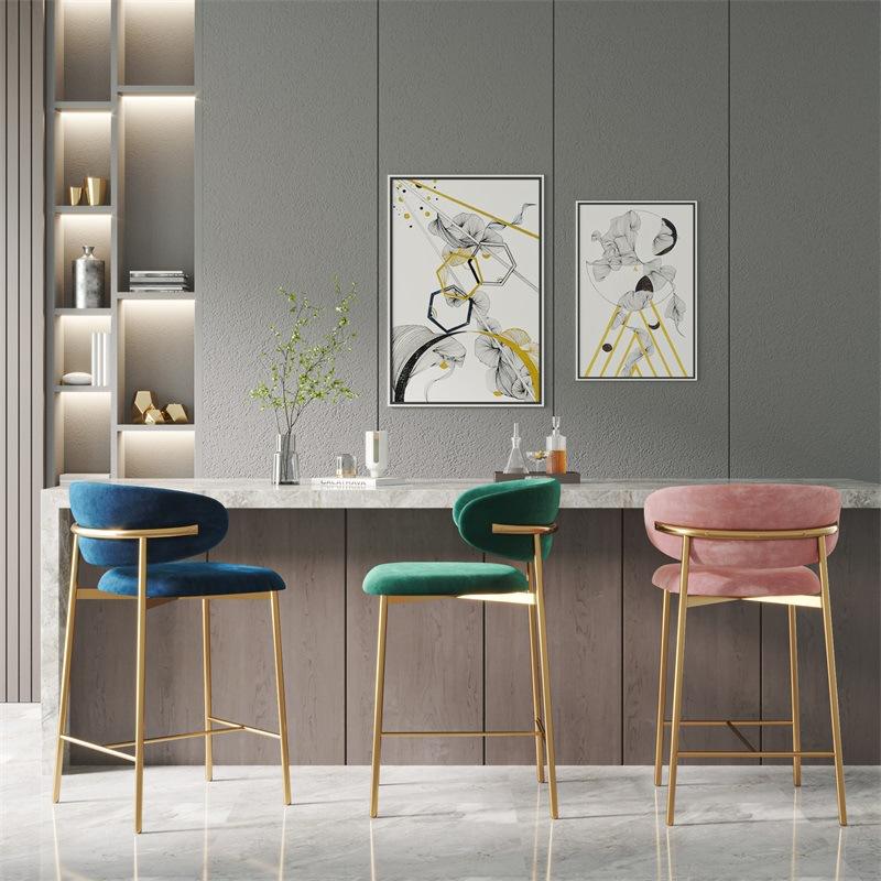 Tabouret de bar moderne et confortable en velours avec pieds en métal, dossier incurvé et robuste pour îlot de cuisine ou comptoir