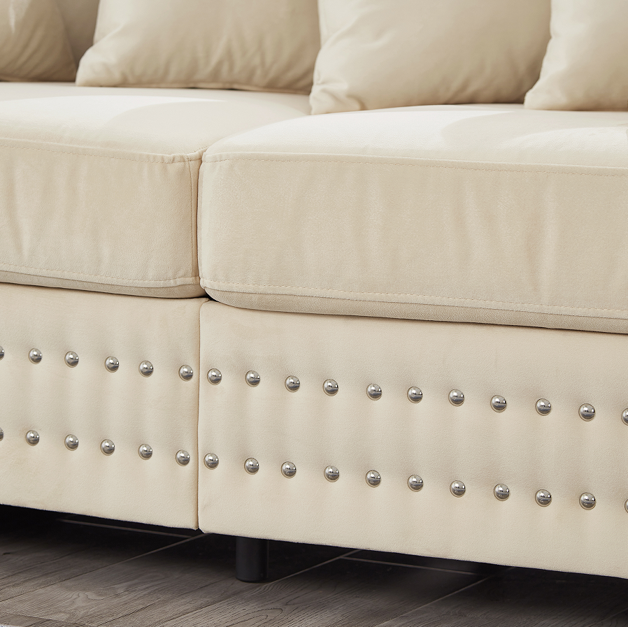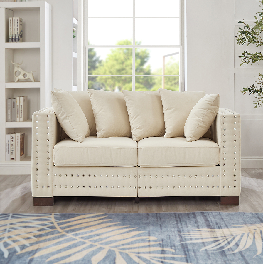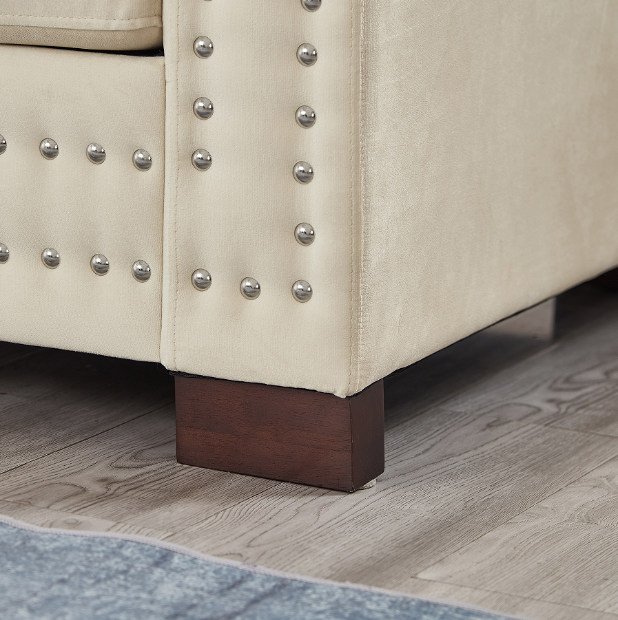 Ensemble de canapés de salon convertible moderne avec accoudoirs carrés, décoration clous argentés, causeuse en velours abricot