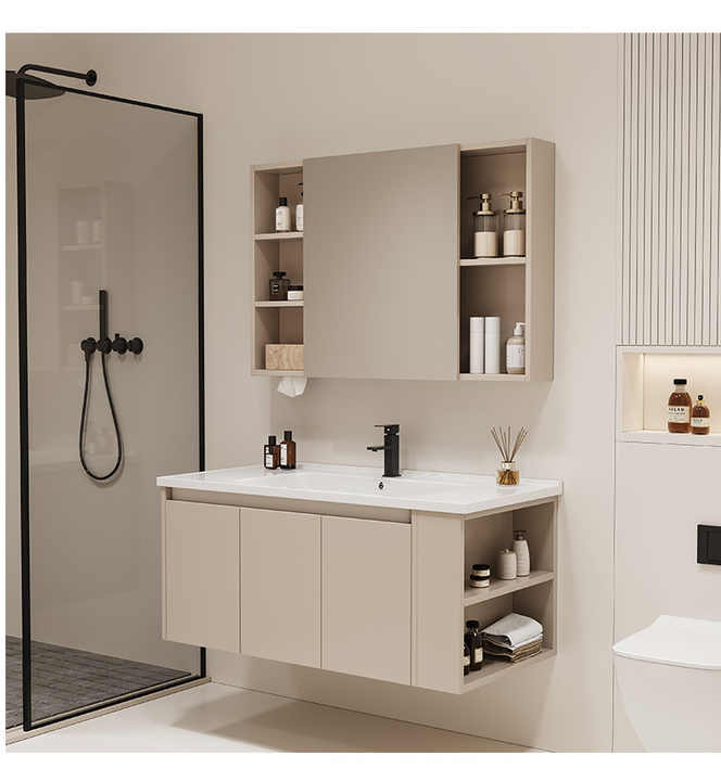 Meuble de salle de bain moderne couleur crème avec miroir intelligent, armoire latérale de rangement et lavabo monobloc en céramique