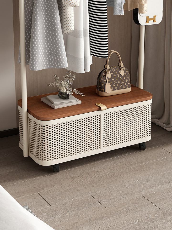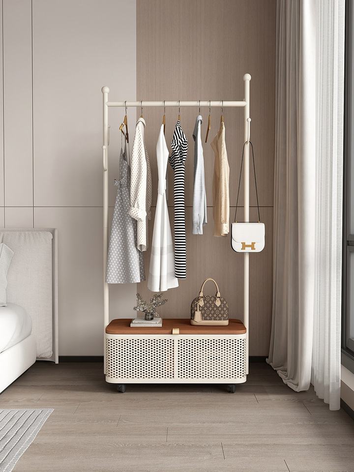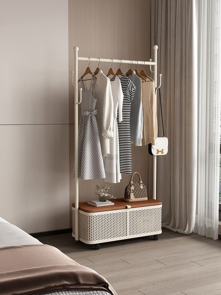 Porte-vêtements sur pied de couleur crème moderne avec panier de rangement et roulettes pour l'organisation des vêtements dans la chambre