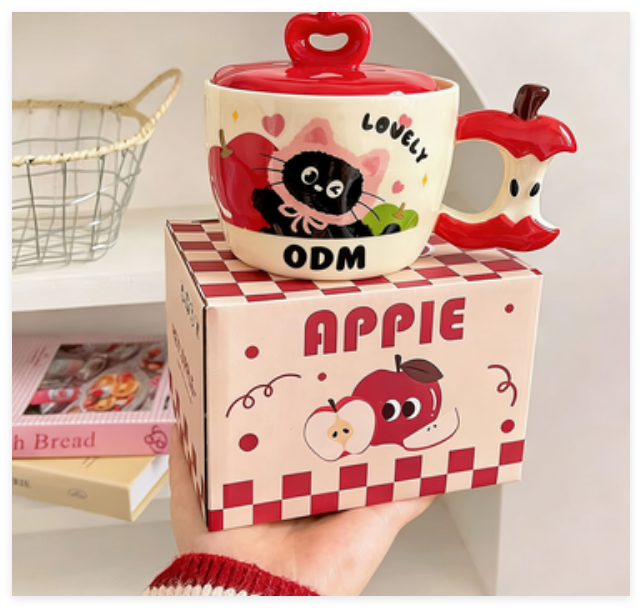 Mug Créatif Moderne en Céramique Chat avec Couvercle Design Pomme Cadeau Parfait Anniversaire Noël pour la Maison Eau Thé