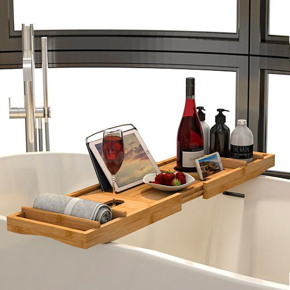 Plateau de bain personnalisé en bambou, caddie de salle d'eau moderne, avec côtés extensibles, plat à savon gratuit
