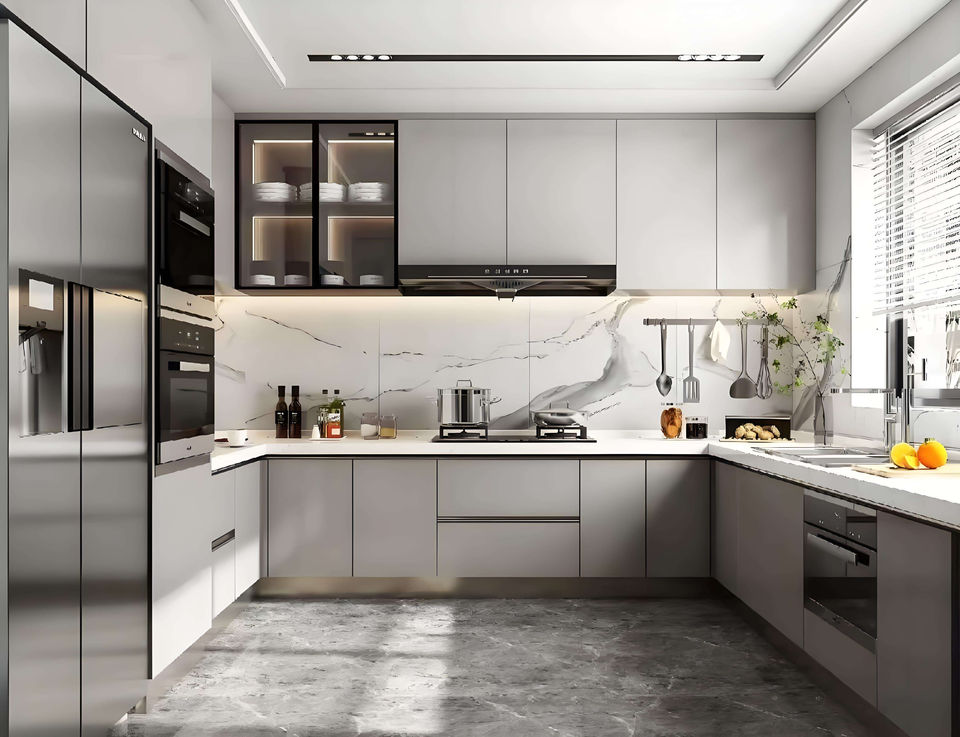 Armoires de cuisine modernes personnalisées avec îlot à fermeture amortie et comptoir en granit pour la construction de maisons ou de villas