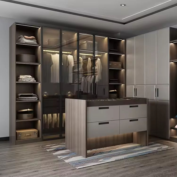 Armoire de luxe moderne et personnalisable à 6 portes pour chambre et salon, avec portes vitrées, rangement autoportant