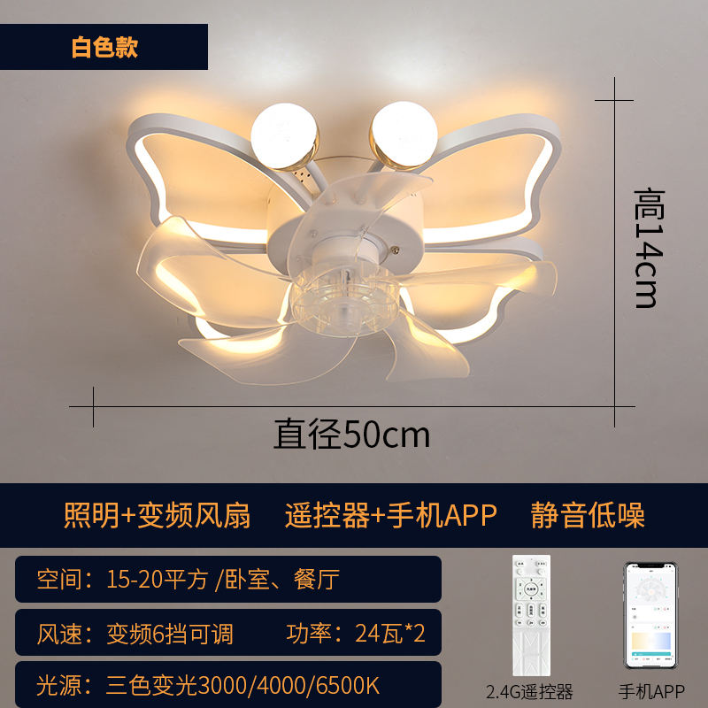 Ventilateur de plafond moderne et mignon avec lumière LED en forme de papillon, moteur DC à 6 vitesses, télécommande, silencieux et intelligent pour chambre à coucher