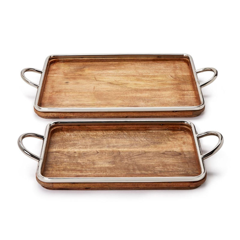 Ensemble de 2 plateaux de service rectangulaires décoratifs modernes en bois de manguier et acier inoxydable avec rebords argentés et poignées pour la décoration de la maison