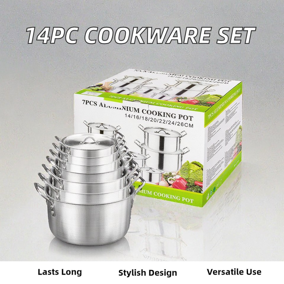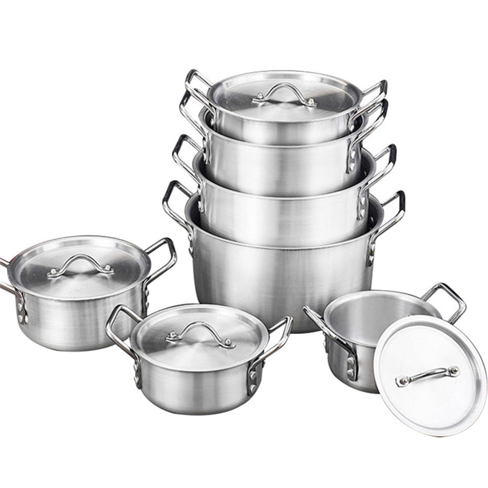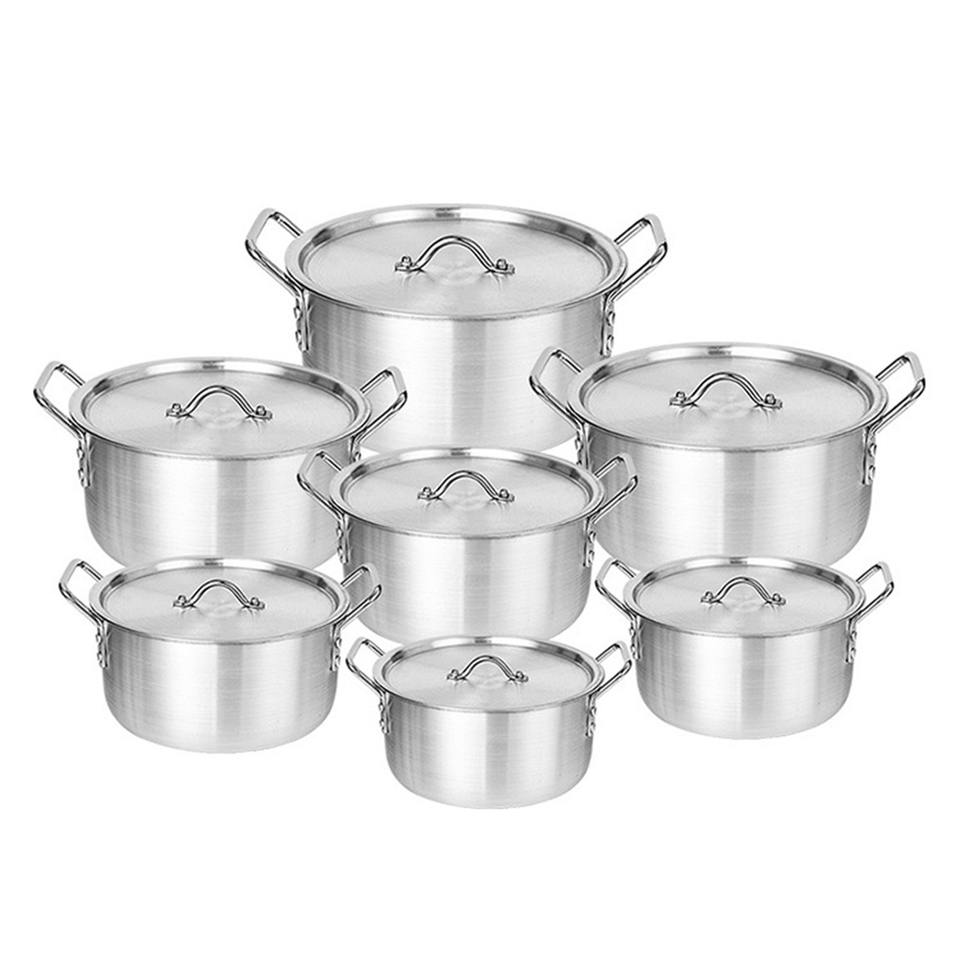 Ensemble de 14 ustensiles de cuisine en aluminium au design moderne, vente en gros, avec marmite à soupe, casseroles et batterie de cuisine en métal