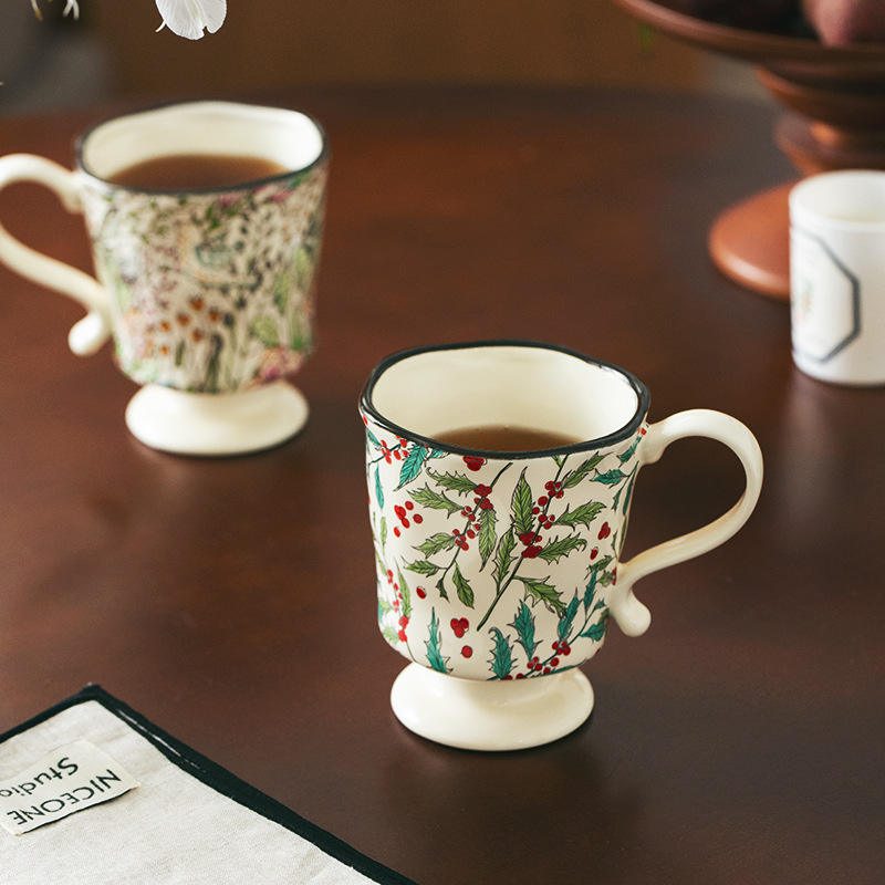 Mug en céramique au design moderne, grande poignée, style britannique vintage, motif floral et d'oiseaux, capacité de 360 ml, tasse à café latte pour les fêtes