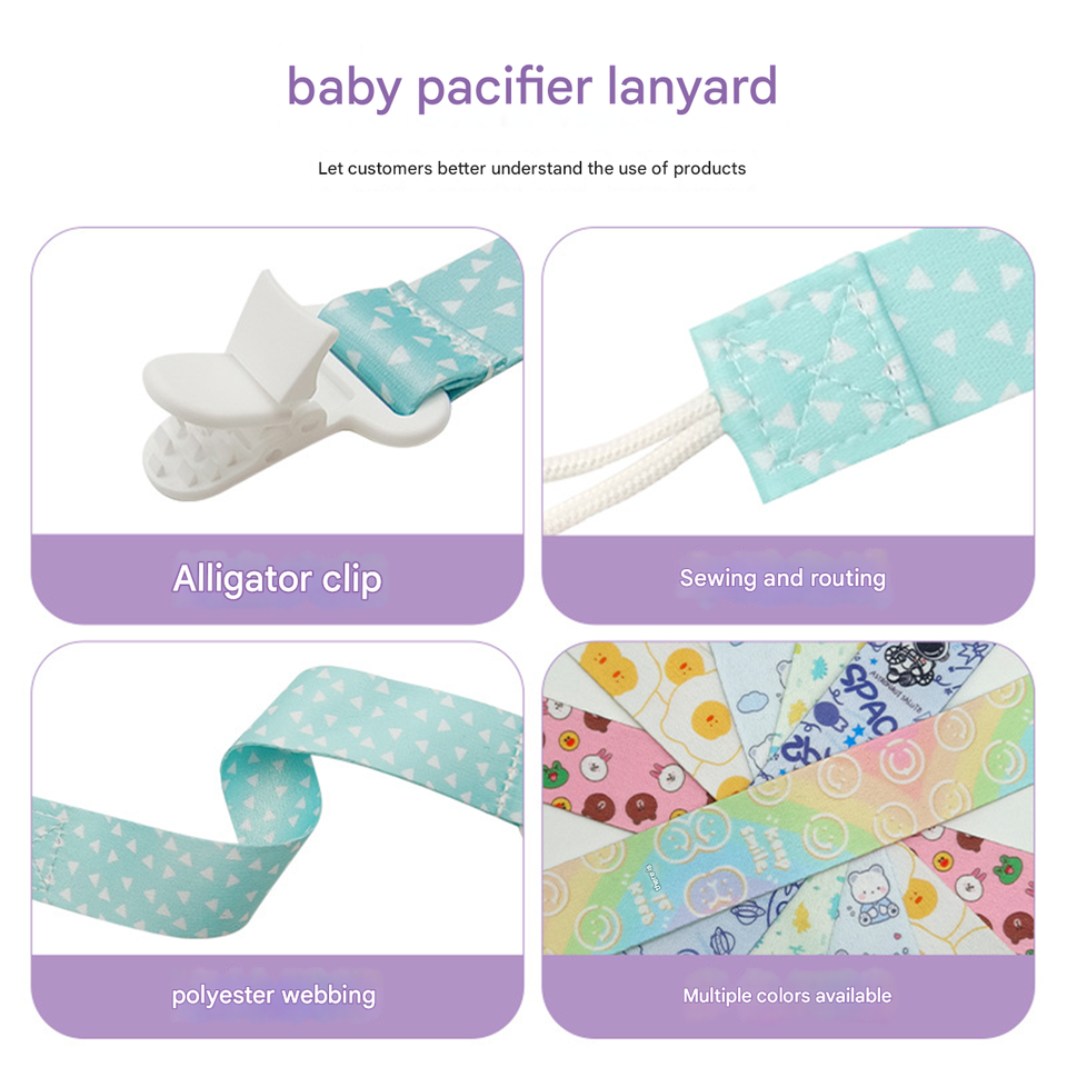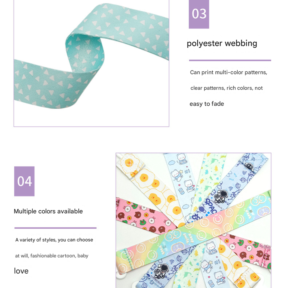 Clips pour bébé en tissu de conception moderne, non toxiques, sublimés, pour garçons et filles, avec cordon pour lanière anti-chute
