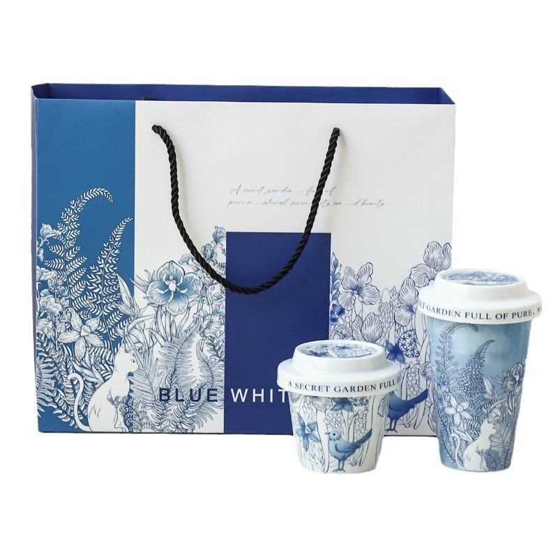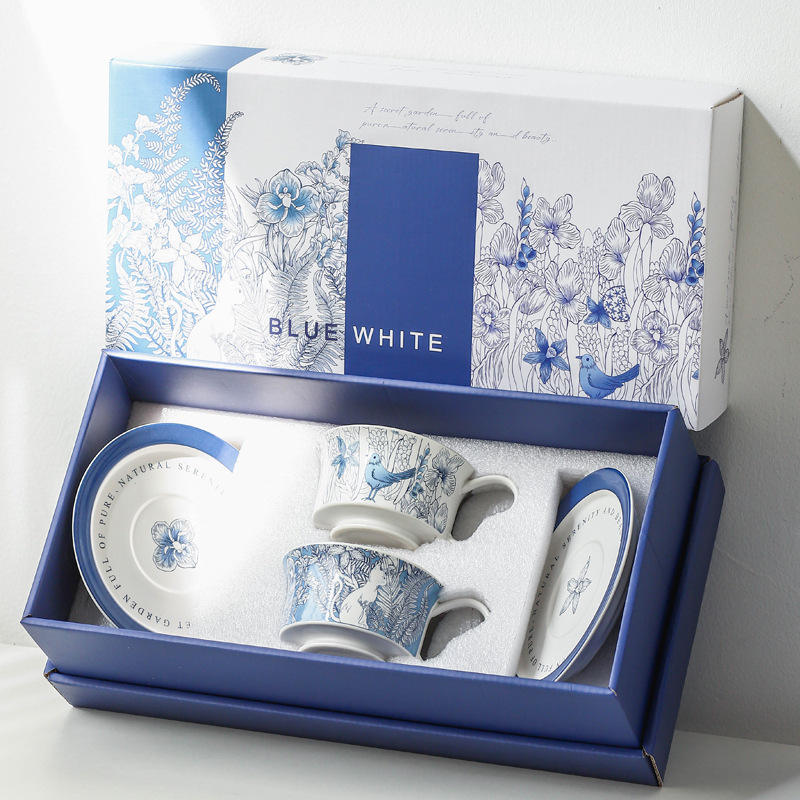 Coffret cadeau tasse en céramique bleu blanc peint à la main de conception moderne coffret niche haut de gamme 400ml pour fête d'affaires Vintage classique ODM chaud