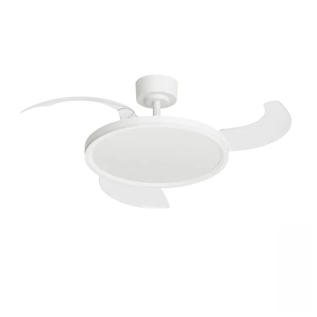 Ventilateur intelligent au design moderne avec 3 pales, moteur DC silencieux, esthétique minimaliste, lumière 3 couleurs, sans pales visibles, lumière libre