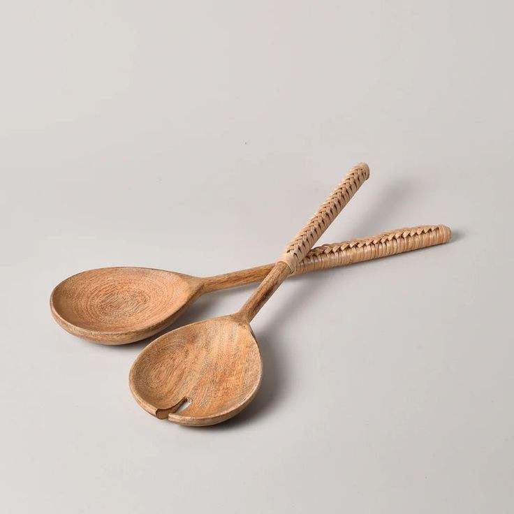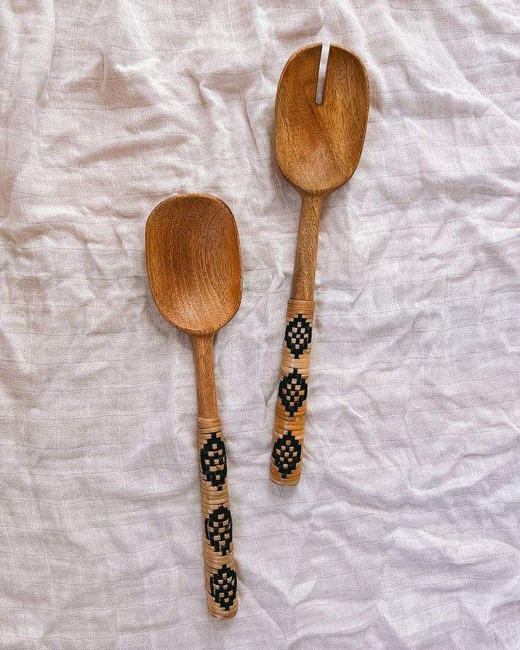 Serveur à salade en bois et rotin