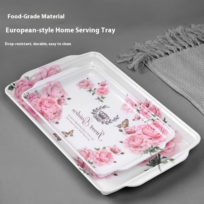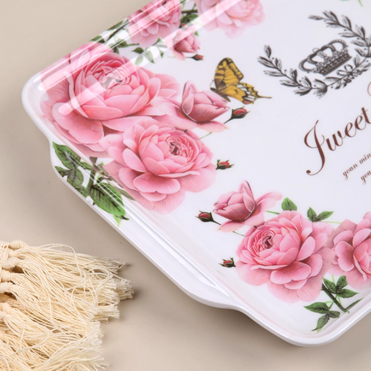 Plateau de Service Rectangulaire en Mélamine Design Moderne Plats Horeca de Luxe Légers Décalcomanie Tasse à Thé Motif Lotus Rose Fruits Polis