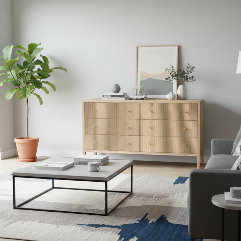Meuble console de salon en bois massif au design moderne avec finition personnalisée et 6 tiroirs pour salon et mobilier de maison