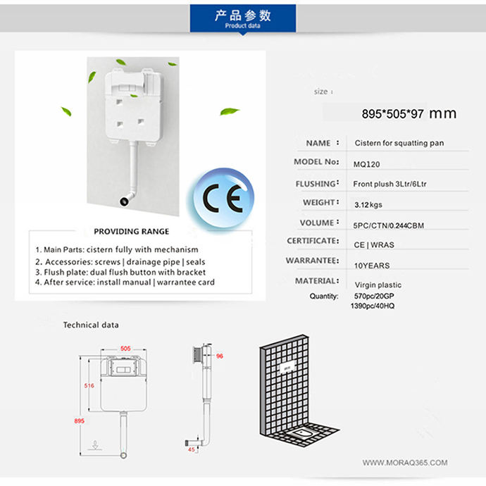 Citerne suspendue en plastique mince de haute qualité de style design moderne par réservoir caché pour boutons poussoirs de toilette en céramique inclus