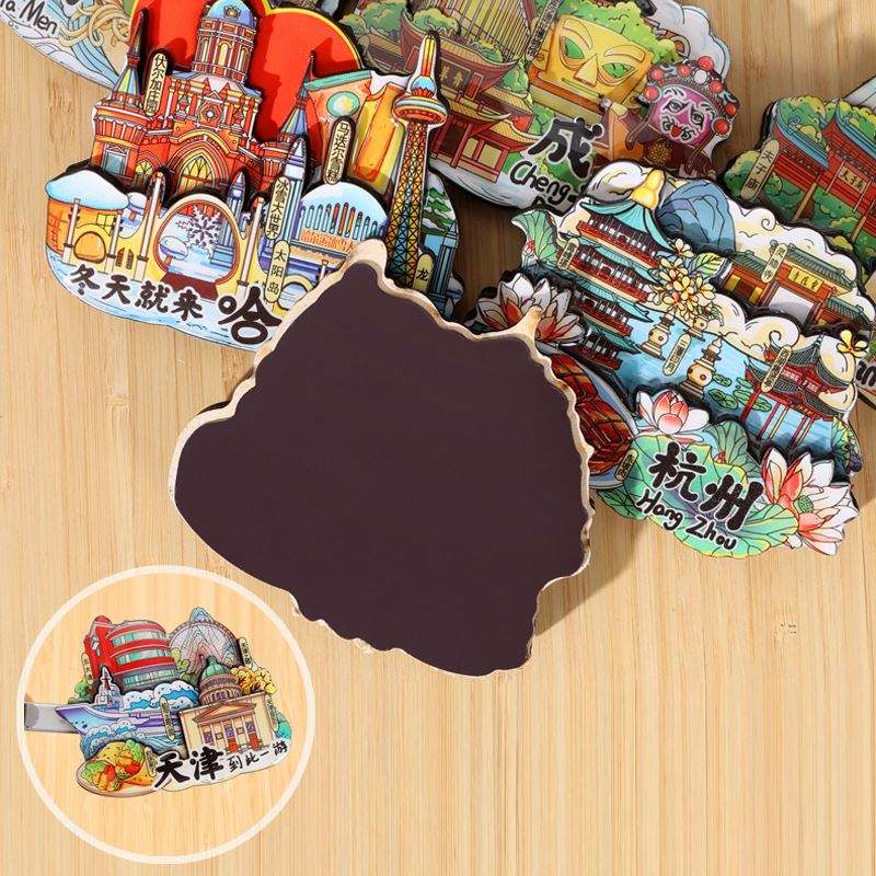 Logo commémoratif d'attraction touristique chinoise en résine époxy et bois, design moderne, aimant 3D stéréo à trois couches, thème ville, original