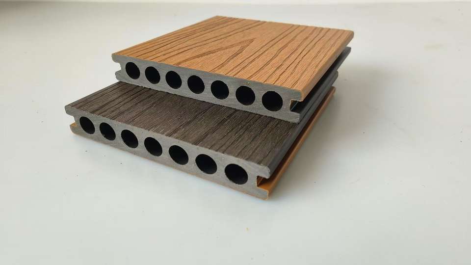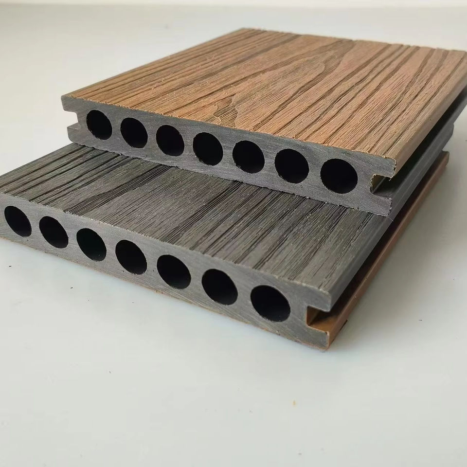 Planche en bois-plastique co-extrudé WPC au design moderne, couleur marbrée, sept trous, pour sol extérieur, jardin, cuisine, pose facile par clic