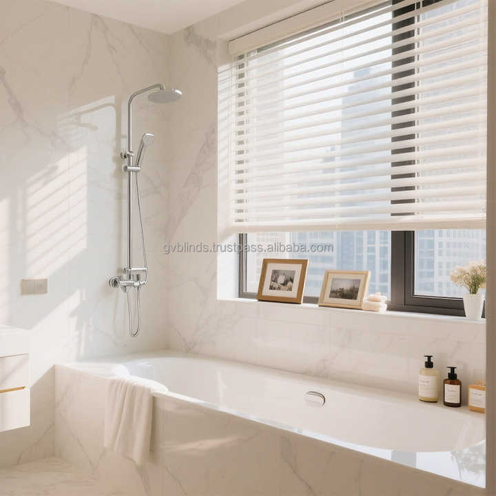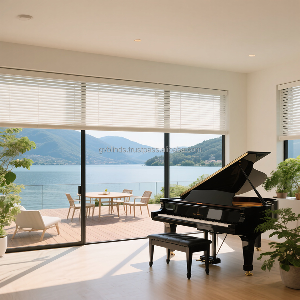 Design moderne 50mm Faux Bois PVC Stores écologiques Zip Track Horizontal avec contrôle sans fil Boutique officielle Made Vietnam