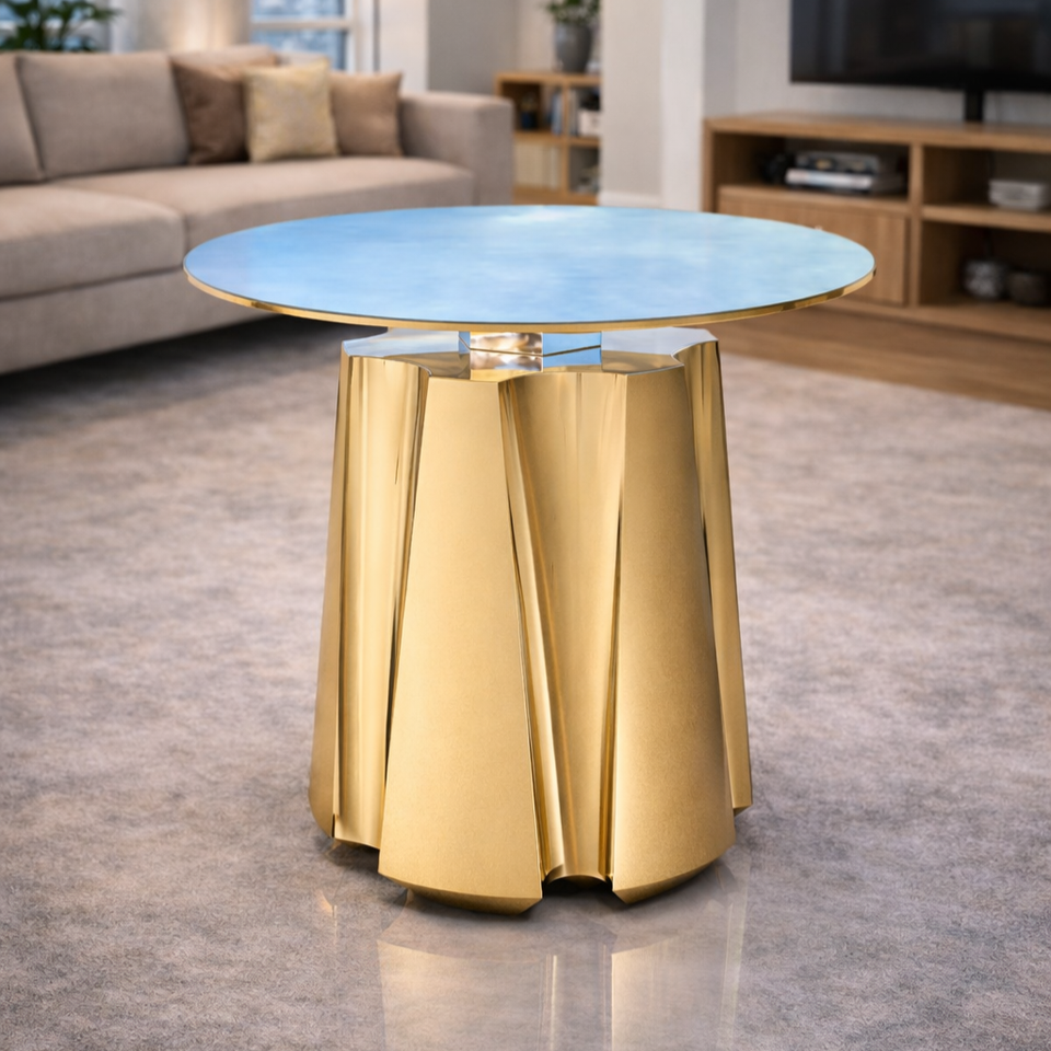 Table basse design moderne avec plateau en métal bleu trempé et colonne dorée audacieuse pour salon, meubles d'intérieur élégants